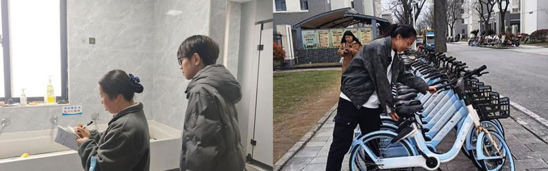 环境整治焕发新颜。罗佳奕小组协助宿管阿姨查寝,排查安全隐患。古拉热木小组在垃圾回收站引导同学规范分类,助力“双碳”目标。齐婉君小组和刘祥平小组整理共享单车,倡导文明停放。