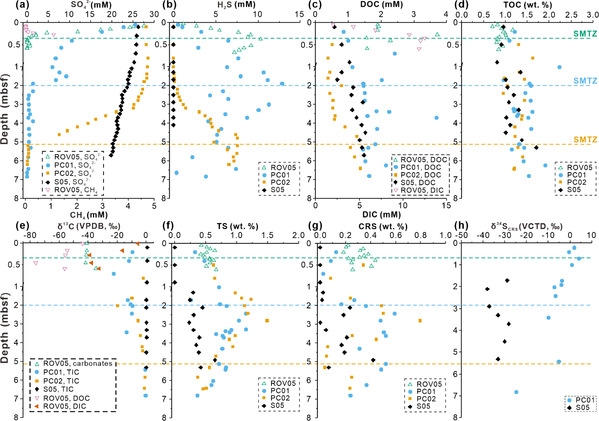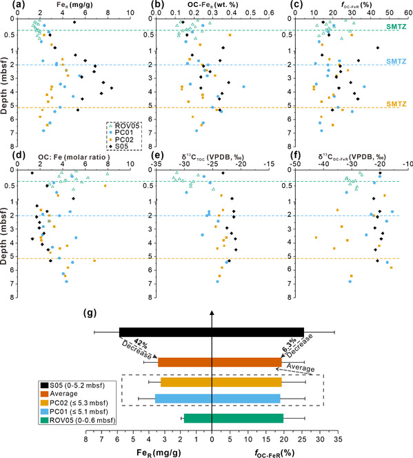 观测到了δ¹³C值极低(低达–42.6‰)的铁结合有机碳,表明其来源可能与甲烷厌氧氧化微生物的活动密切相关(图1);