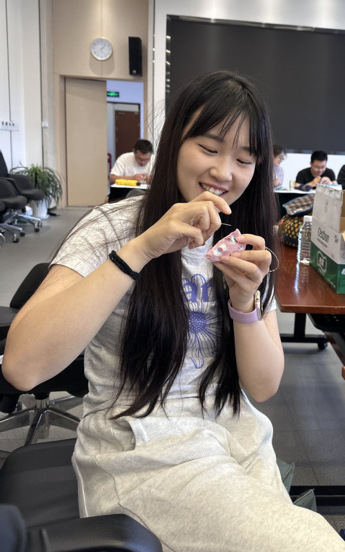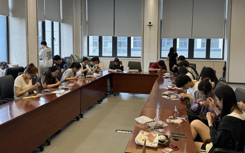活动主持人、24级研究生吴小雨结合小满节气习俗与艾草文化,生动讲解了香囊的历史渊源与制作要点,通过现场示范展示香囊缝制的关键技巧。学员们纷纷穿针引线,填充艾草,缝合收口,在轻松愉悦的氛围中感受传统技艺与青春活力碰撞的热烈氛围。一针一线的专注,一草一木的清香,让学员们在快节奏学习生活中慢下脚步,体悟传统民俗的文化浸润,感受手作带来的心灵温度。尽管部分学员初次接触手工缝制,但经过相互交流与协作,一个个造型别致、散发着淡淡艾香的香囊逐渐成型。