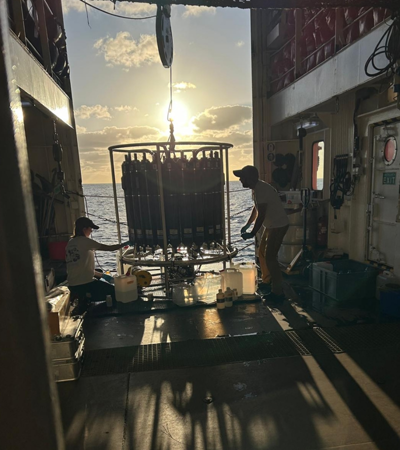 布雷耶博士后(左)与永利yl23411巴尔塔教授(右)从大西洋采集海水样本。