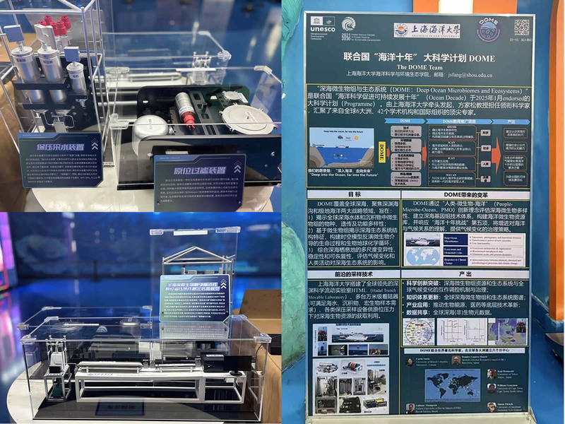 DOME大科学计划全海深微生物胞外酶原位条件测定装置、保压采水装置、原位过滤装置等三个模型参加位于上海海昌海洋公园海底世界馆的中国大洋协会成立35周年成果回顾展暨联合国海洋十年中国行动展,并以展板形式详细介绍了DOME大科学计划的内涵、意义,提高公众对DOME的认识。